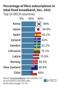 La Organización para la Cooperación y el Desarrollo Económico (OCDE) destacó al sector de telecomunicaciones chileno en su reporte de julio de 2023 dentro de los 10 países con mayor porcentaje de suscripciones de fibra óptica en relación al total de contratos de internet fija.